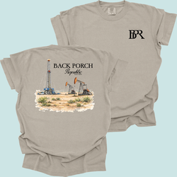 - Back: Oilfield rig graphic with “Back Porch Republic” branding